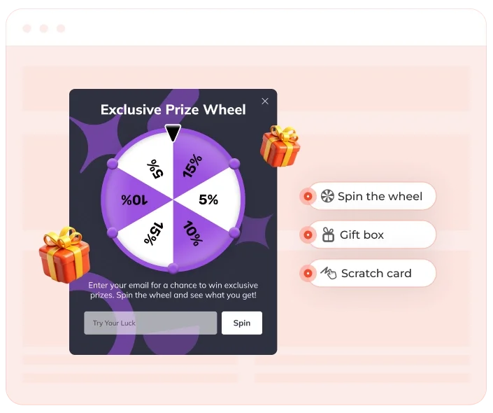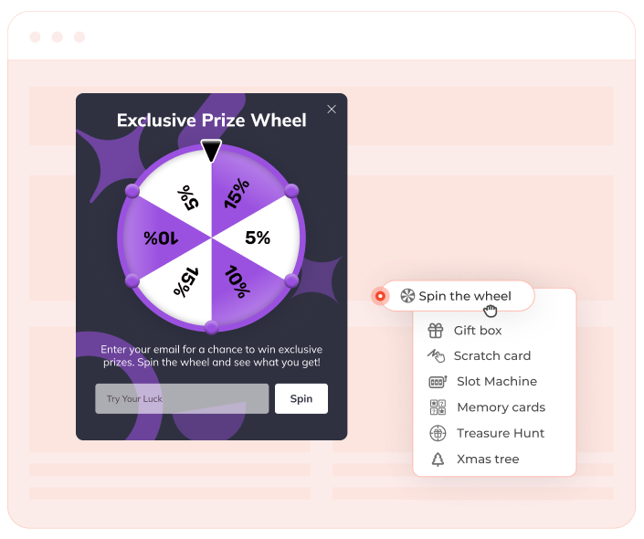 Gamified popups are interactive, game-like elements seamlessly integrated into your website’s design to capture visitors’ attention and encourage them to take action — whether it’s subscribing to your mailing list, completing a purchase, or claiming a special offer. By embedding gamification elements directly into your site's user interface (UI), you transform passive browsing into an engaging and interactive journey. Visitors feel like they’re playing a game, not just interacting with a traditional marketing popup, which increases both engagement and conversion rates.
