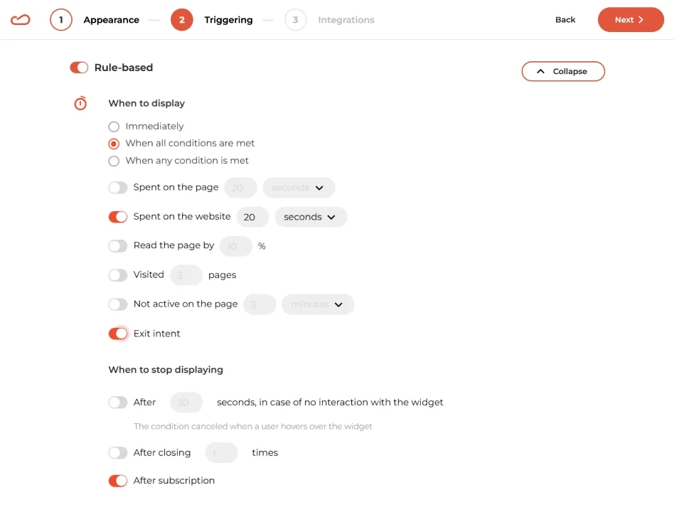 Timing and targeting are where Claspo really shines. You can set up basic display rules, like time spent on site or scroll depth, or go further with advanced logic. Use cookies, UTM parameters, or even data layer variables to trigger popups with surgical precision. This allows you to go beyond random popups and instead build targeted, goal-oriented gamified pop-up campaigns that align with your broader marketing strategy.
