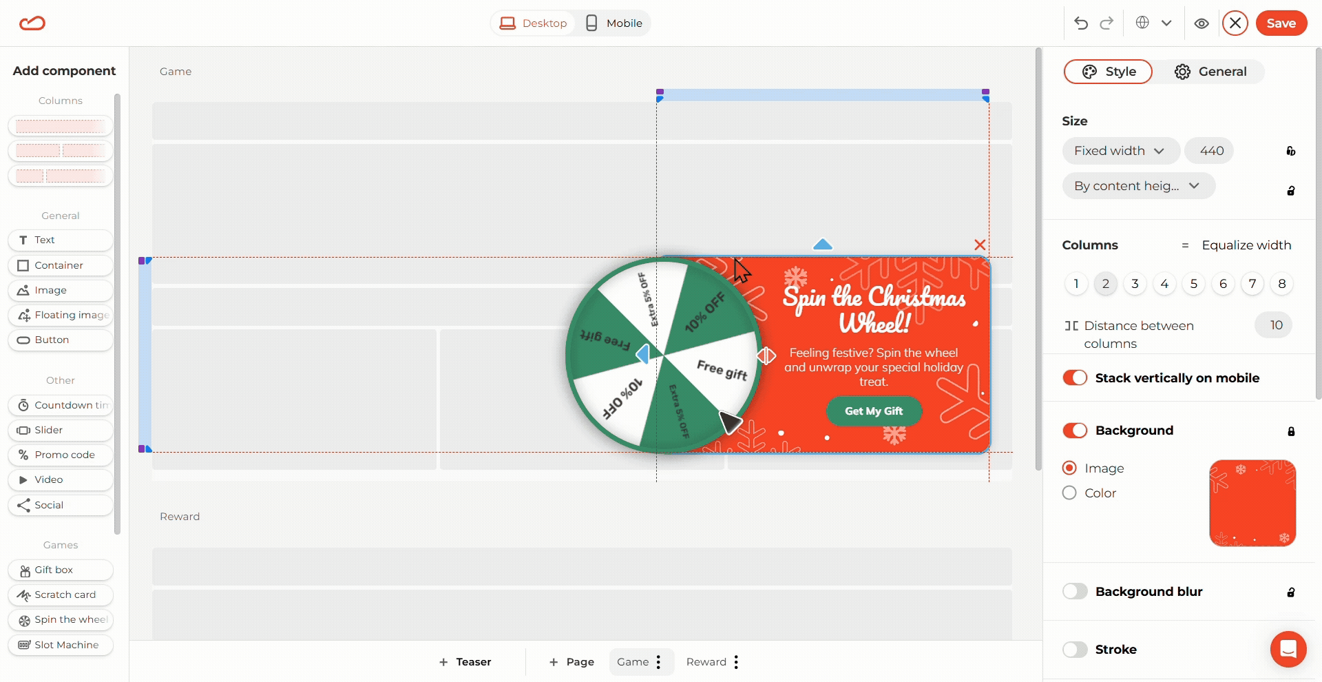 We added a “Hide overflow” toggle for columns. Use this to hide parts of any component that sticks out of the frame. It's especially good for creating a “half-wheel” design for the Spin-the-Wheel component.